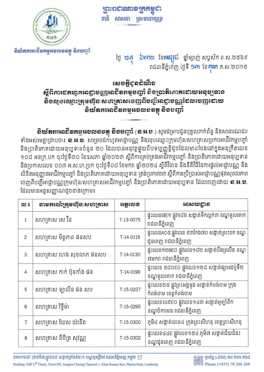 នៅថ្ងៃទី១៤ ខែតុលា ឆ្នាំ២០២៥ នេះ និយ័តករអាជីវកម្មអចលនវត្ថុ និងបញ្ចាំ បានសម្រេចដកហូតអាជ្ញាបណ្ណ និងលុបឈ្មោះក្រុមហ៊ុន/សហគ្រាសប្រកបអាជីវកម្មបញ្ចាំ និងប្រាតិភោគដោយអនុប្បទានចំនួន ២០ ដែលបានអនុវត្តផ្ទុយពីបទប្បញ្ញត្តិ ស្តីពីការប្រើប្រាស់អាជ្ញាបណ្ណផុតសុពលភាព។