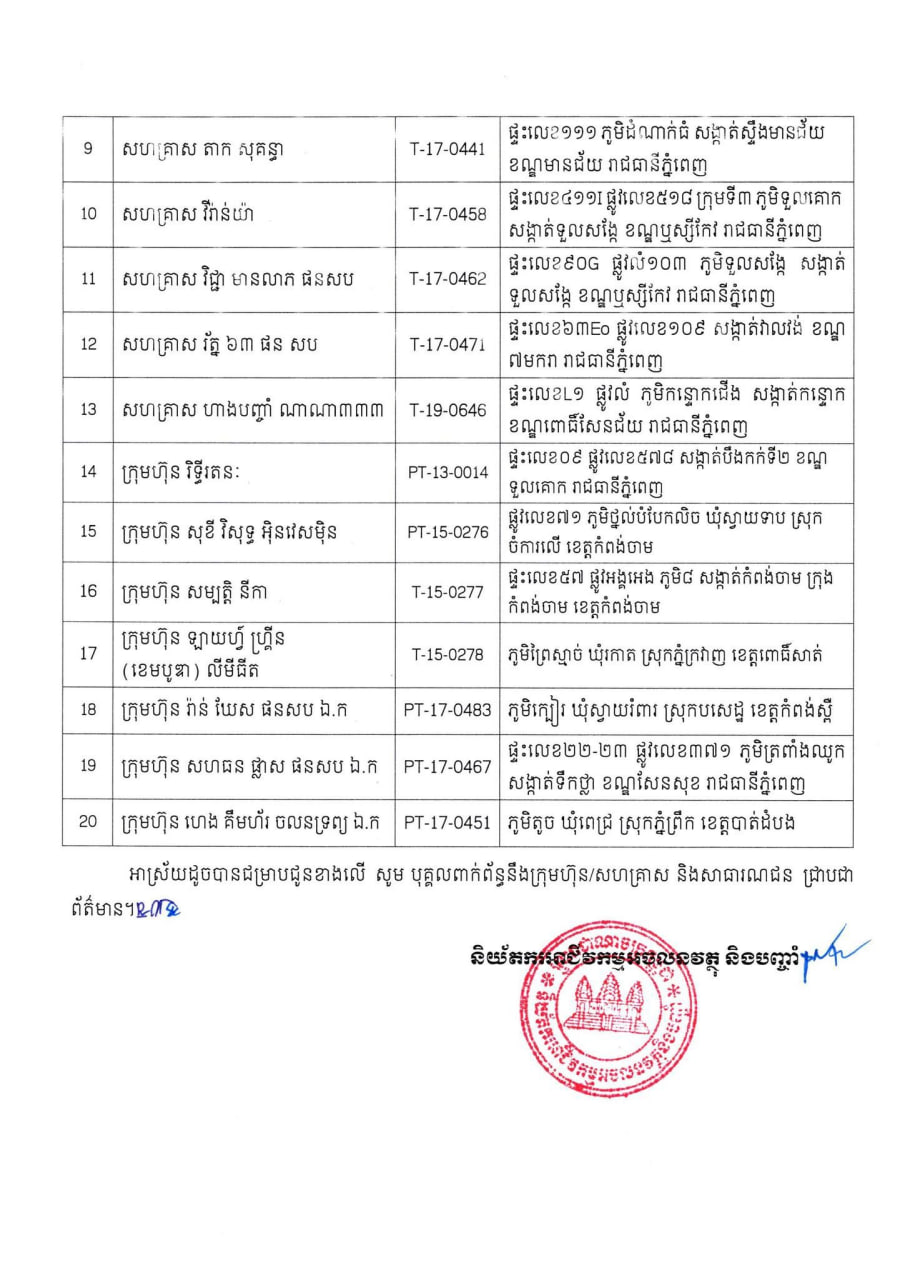 យោងតាមការបញ្ជាក់នៅក្នុងសេចក្ដីជូនដំណឹង មានក្រុមហ៊ុន/សហគ្រាសចំនួន២០ ដែលត្រូវបាដកហូតអាជ្ញាបណ្ណនិងលុបឈ្មោះក្រុមហ៊ុនមានដូចជា៖