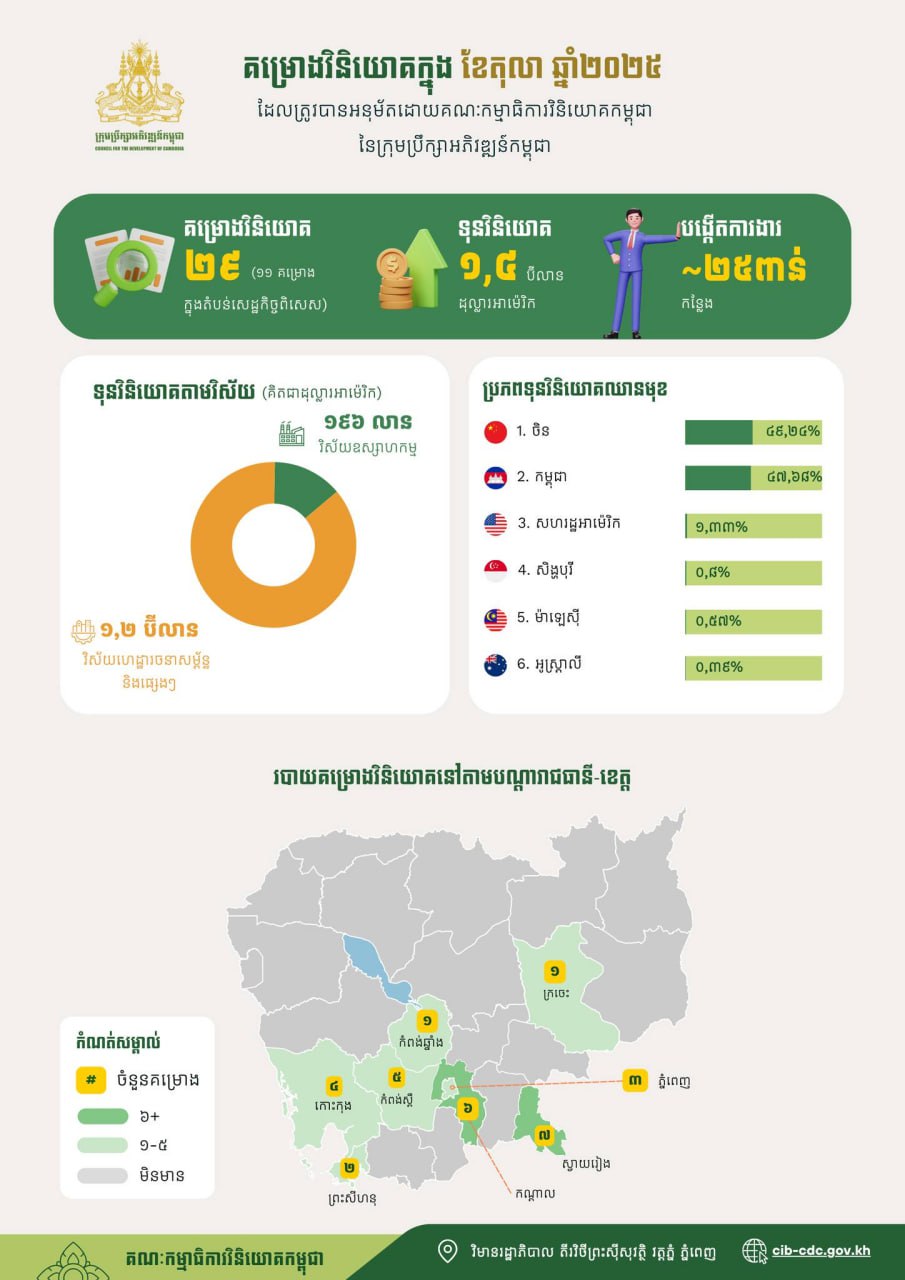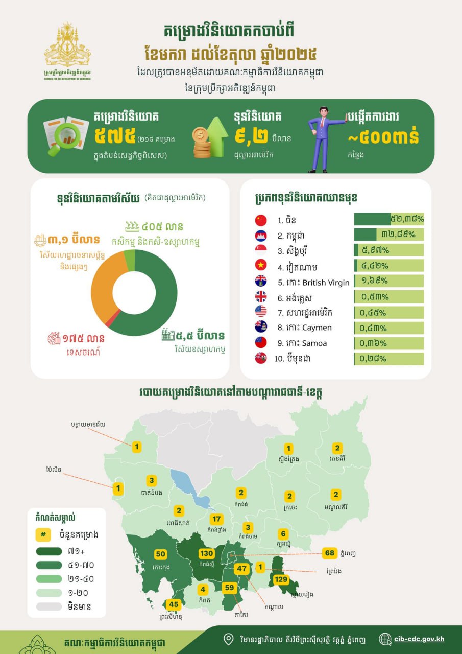 ដំណឹងល្អ ! ក្នុងរយៈពេល១០ខែនៃឆ្នាំ២០២៥នេះ រាជរដ្ឋាភិបាល តាមរយៈគណៈកម្មាធិការវិនិយោគកម្ពុជាដែលជាសេនាធិការ បានសម្រេចុះបញ្ជីគម្រោងវិនិយោគចំនួន ៥៧៥គម្រោង ក្នុងទំហំទុនវិនិយោគសរុប ប្រមាណ ៩,២ប៊ីលានដុល្លារអាម៉េរិក កើនឡើងចំនួន ២២៩គម្រោង ស្មើនឹងប្រមាណ ៦៦% ខណៈទុនវិនិយោគមានការកើនឡើងប្រមាណជិត ៣,៧ប៊ីលានដុល្លារអាម៉េរិក ស្មើនឹងប្រមាណ ៦៧% បើប្រៀបធៀបនឹងរយៈពេលដូចគ្នាក្នុងឆ្នាំ២០២៤ ដែលមានគម្រោងវិនិយោគត្រឹមតែ ៣៤៦គម្រោង ក្នុងទំហំទុនវិនិយោគប្រមាណ ៥,៥ប៊ីលានដុល្លារអាម៉េរិក។