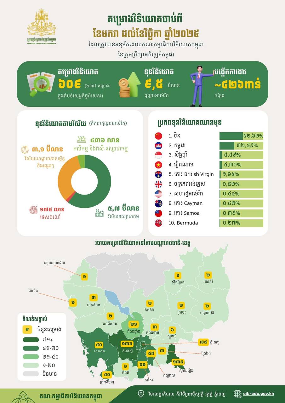 ក្នុងរយៈពេល១១ខែនៃឆ្នាំ២០២៥នេះ គណៈកម្មាធិការវិនិយោគកម្ពុជាបានសម្រេចុះបញ្ជីគម្រោងវិនិយោគចំនួន ៦០៩គម្រោង ក្នុងទំហំទុនវិនិយោគសរុបប្រមាណ ៩,៥ប៊ីលានដុល្លារអាម៉េរិក ដែលបង្ហាញថាចំនួននៃគម្រោងវិនិយោគមានការកើនឡើង ២២០គម្រោង ស្មើនឹងប្រមាណ ៥៧% ខណៈទុនវិនិយោគមានការកើនឡើងប្រមាណ ៣ ប៊ីលានដុល្លារអាម៉េរិក ស្មើនឹងប្រមាណ ៤៧% បើប្រៀបធៀបនឹងរយៈពេលដូចគ្នាក្នុងឆ្នាំ២០២៤ ដែលគណៈកម្មាធិការវិនិយោគកម្ពុជាបានចុះបញ្ជីគម្រោងវិនិយោគត្រឹមតែចំនួន ៣៨៩គម្រោង ក្នុងទំហំទុនវិនិយោគប្រមាណ ៦,៥ប៊ីលានដុល្លារអាម៉េរិក។