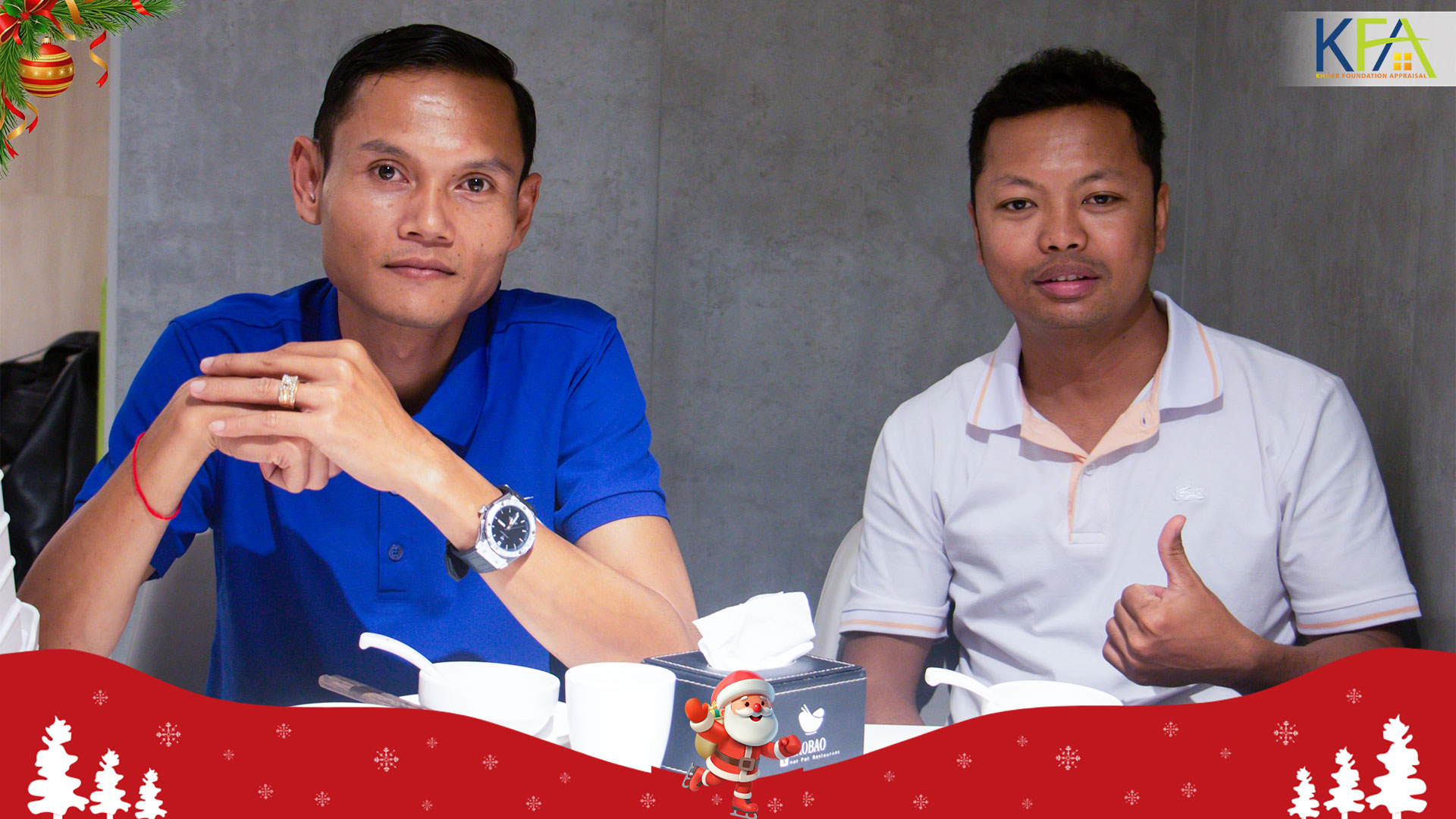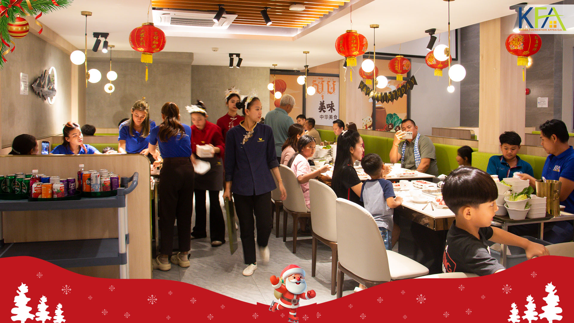 ក្រោមការផ្ដួចផ្តើម និងអនុញ្ញាតពីសំណាក់លោកឧកញ៉ា នួន រិទ្ធី និងលោកជំទាវ ស្រី ស្រស់ នៅល្ងាចថ្ហៃទី២៥ ខែធ្នូ ឆ្នាំ២០២៥ ដែលជាពិធីបុណ្យ ណូអែល ត្រៀមឆ្លងឆ្នាំសកល ២០២៦ បណ្តាបុគ្គលិកគ្រប់លំដាប់ថ្នាក់នៃក្រុមហ៊ុន ខ្មែរហ្វោនដេសិនអឹព្រេហ្សល (KFA) បានជួបជុំគ្នានៅភោជនីយដ្ឋាន បែបចិន Lao Bao hot pot ក្បែរមហាវិថីសម្ដេចតេជោ ហ៊ុន សែន និងទទួលទានអាហារសាមគ្គីយ៉ាងមានរសជាតិ ពោរពេញដោយក្ដីសោមនស្សរីករាយ។
