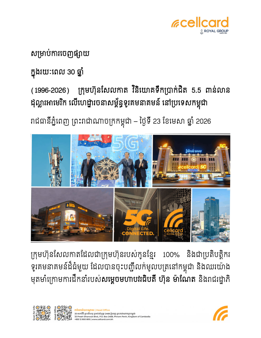 ក្រុមហ៊ុនសែលកាតនឹងបន្តពង្រីកបណ្តាញ 5G របស់ខ្លួនទៅកាន់បណ្តាខេត្តសំខាន់ៗផ្សេងទៀត ដើម្បីគាំទ្រដល់ចក្ខុវិស័យរបស់កម្ពុជា ក្នុងការកសាងសេដ្ឋកិច្ច ទំនើប បរិយាបន្ន និងជំរុញដោយឌីជីថល ព្រមទាំងផ្លាស់ប្ដូររបៀបដែលមនុស្ស រស់នៅ ធ្វើការ រៀនសូត្រ និងកម្សាន្ត។